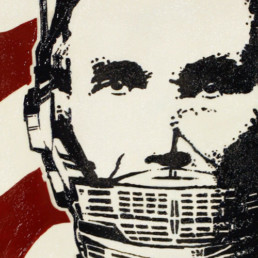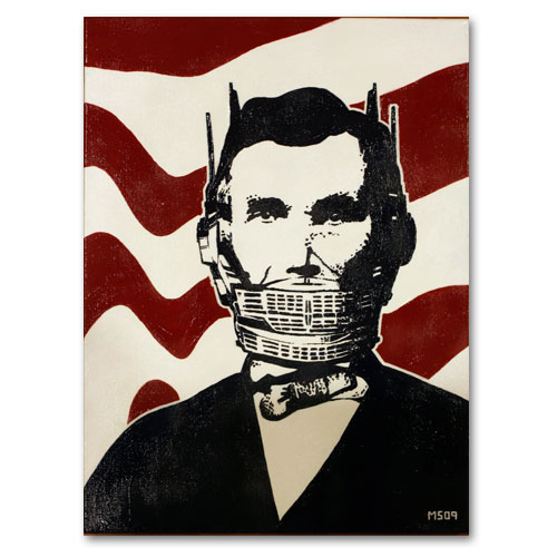 Painting combining the traditional portrait of Abraham Lincoln with some elements of a Lincoln navigator and Transformers.