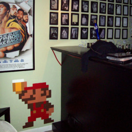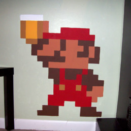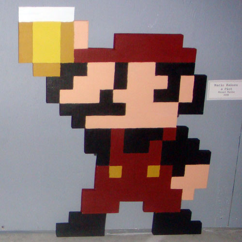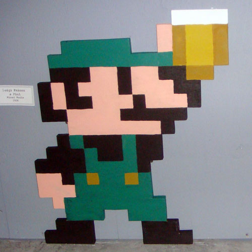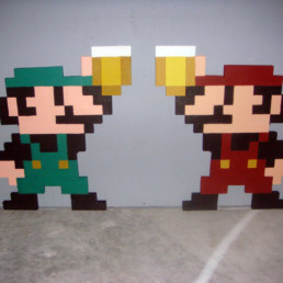 Wooden cutouts that depict Mario and Luigi toasting some delicious beers.